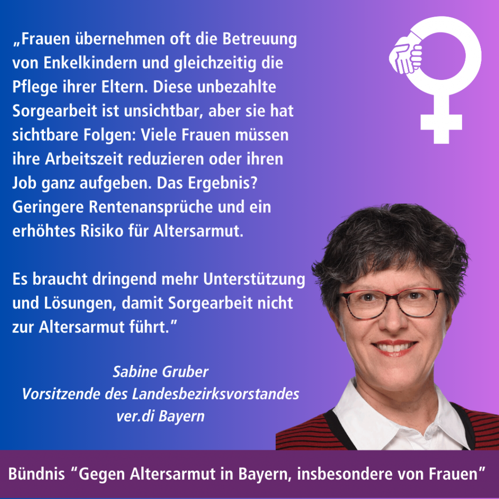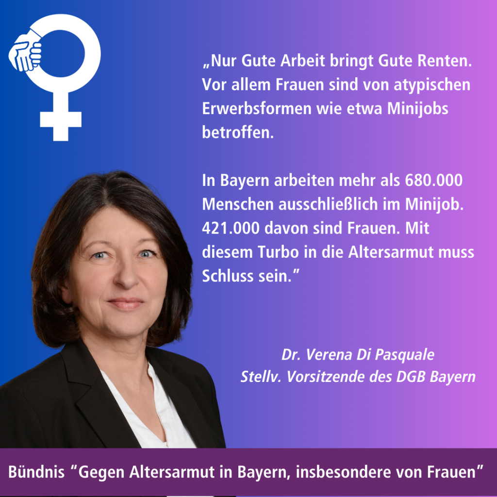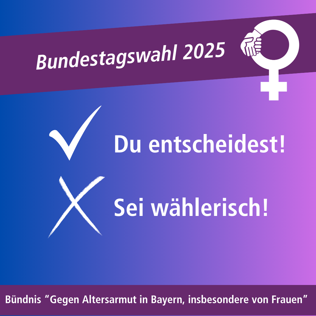 Das Bündnis „Gegen Altersarmut in Bayern, insbesondere von Frauen“ lenkt im Bundestagswahlkampf den Fokus auf das drängende Thema Altersarmut. Die Rente ist nicht nur dafür gedacht, das entfallende Einkommen aus dem Berufsleben zu ersetzen – sie muss auch ein würdevolles Leben im Alter garantieren. Altersarmut ist daher eine zentrale soziale Frage, die dringend angegangen werden muss.