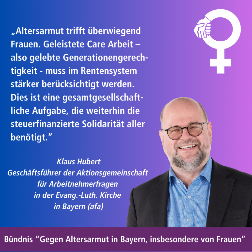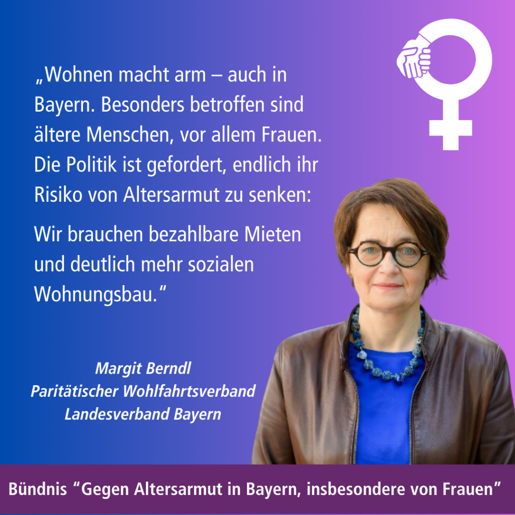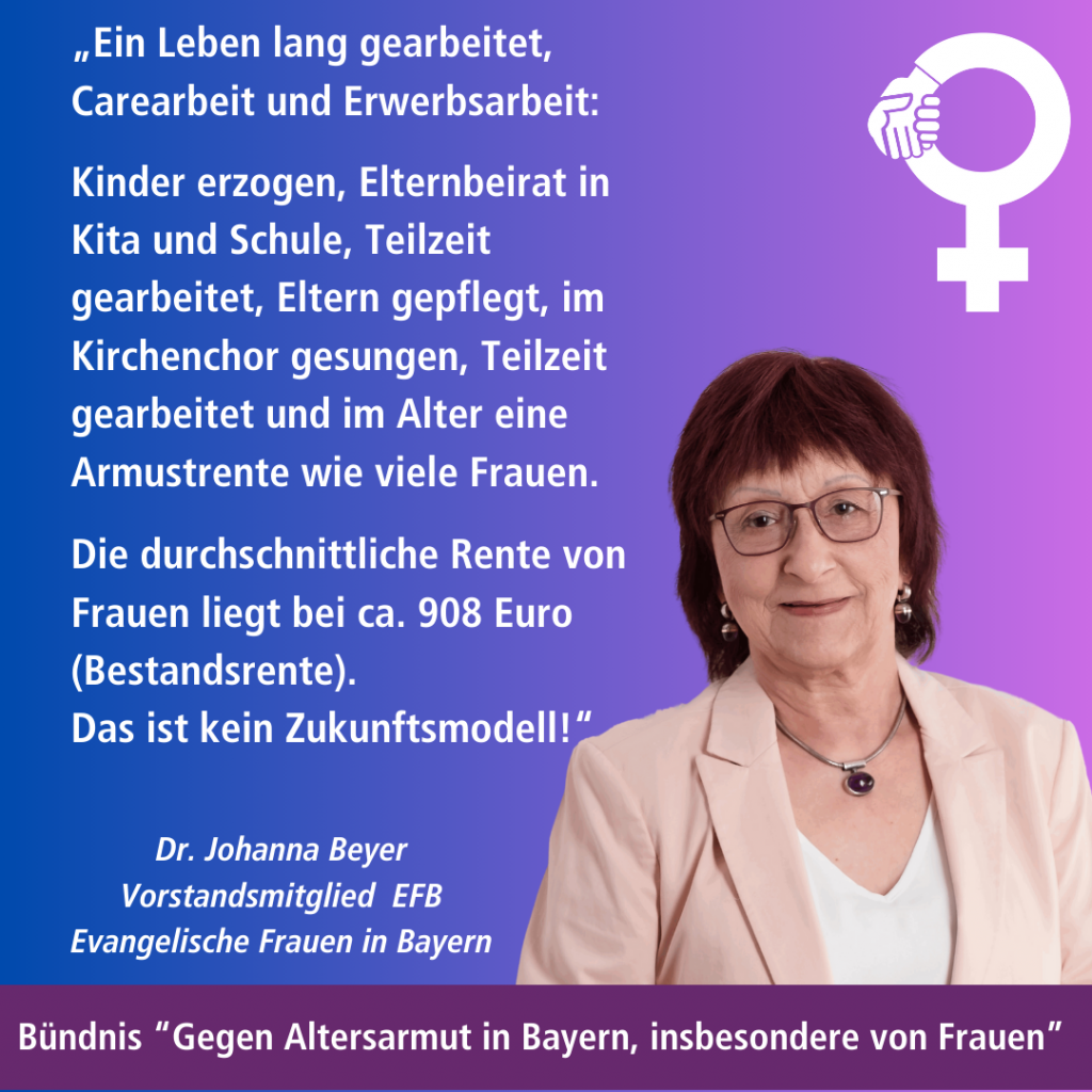 Das Bündnis „Gegen Altersarmut in Bayern, insbesondere von Frauen“ lenkt im Bundestagswahlkampf den Fokus auf das drängende Thema Altersarmut. Die Rente ist nicht nur dafür gedacht, das entfallende Einkommen aus dem Berufsleben zu ersetzen – sie muss auch ein würdevolles Leben im Alter garantieren. Altersarmut ist daher eine zentrale soziale Frage, die dringend angegangen werden muss.