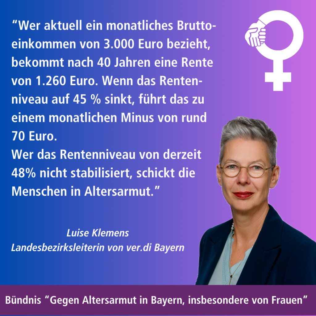 Im reichen Bayern droht vielen Menschen Altersarmut – „ein Skandal, den die Gesellschaft nicht weiter hinnehmen darf“, erklärte Luise Klemens, Landesbezirksleiterin von ver.di Bayern. ver.di hat deshalb am 04. Juli 2017 in Ingolstadt zusammen mit dem DGB, Einzelgewerkschaften und anderen Verbänden und Organisationen eine „Resolution gegen Altersarmut in Bayern“ verabschiedet und das „Bündnis gegen Altersarmut in Bayern, insbesondere von Frauen“ gegründet.